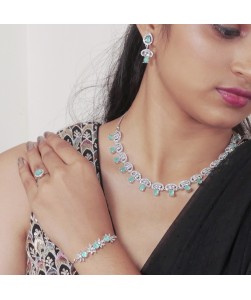₹2,998.35 -33.33% ₹1,999.00Add a touch of refined elegance to your ensemble with this complete 4-piece silver-toned jewelry set. Designed with shimmering cubic zirconia and soft Turquoise stones, this set exudes sophistication and charm. The necklace, earrings, ring, and adjustable bracelet are coordinated with a delicate yet luxurious design, perfect for both modern and traditional outfits.